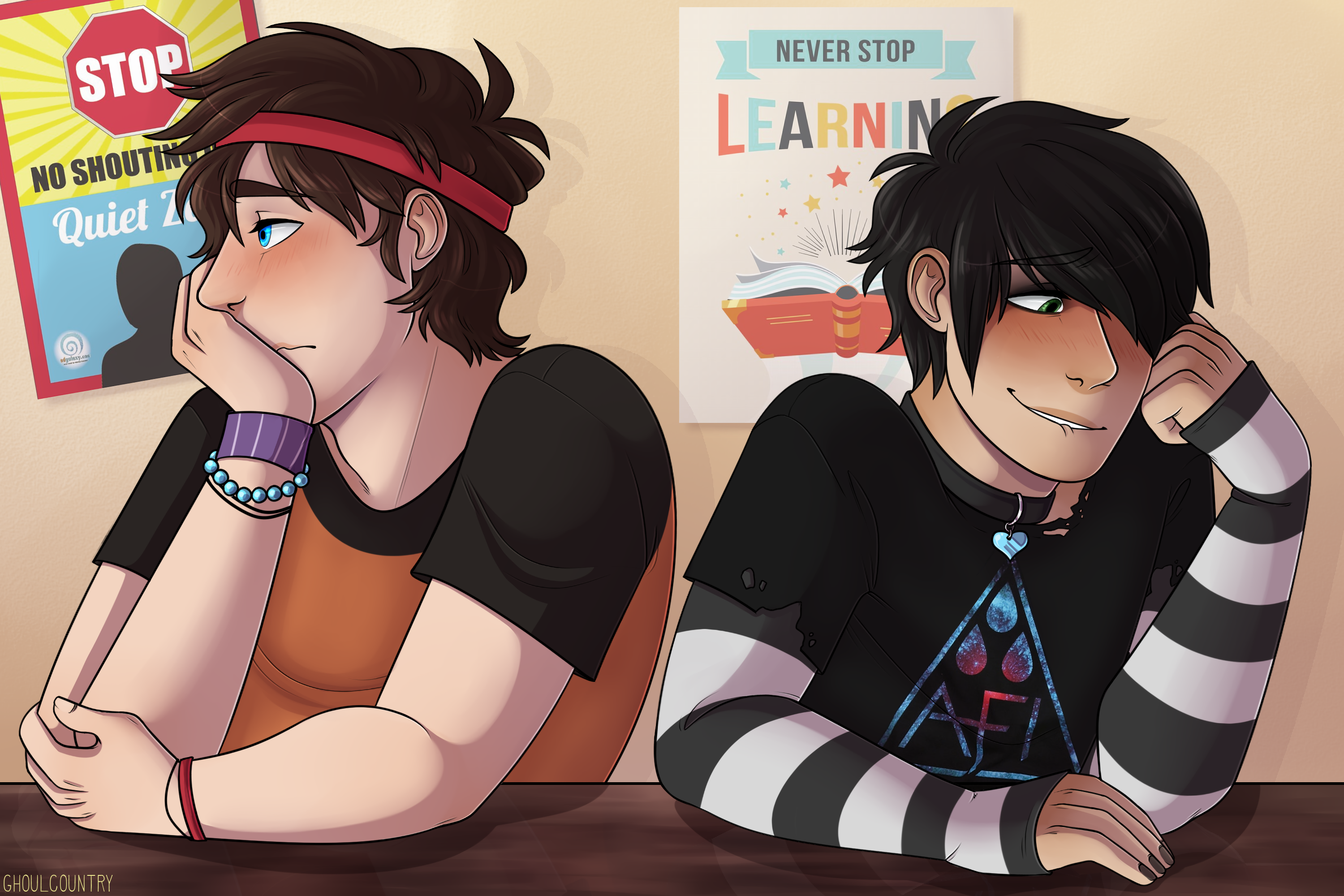 we made both of these guys back in early high school before we knew each other. a real baby's first OC situation heheh. a few years ago we gave them some revamps and smushed 'em together, then i had the idea to draw them in high school using their old designs. get cringe era'd, nerds.
